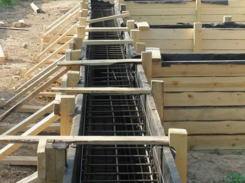 Конструкция: непрерывная полоса бетона под несущими стенами. Глубина — от 40 см (мелкозаглублённый) до 1,8 м (полнозаглублённый).