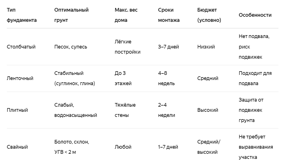 - Бюджет и сроки. Хотите быстро и недорого — смотрите в сторону винтовых свай. Долговечно и основательно — ленточный или монолитный.