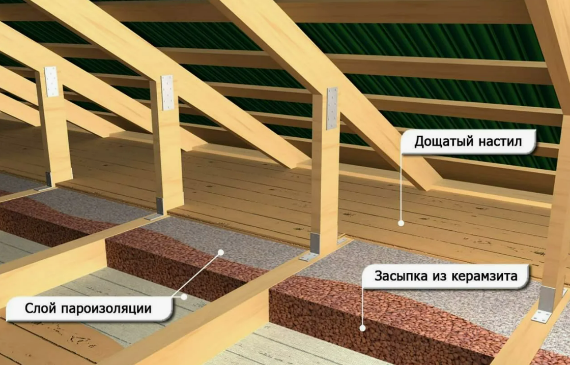- Настил (при необходимости): Если на чердаке планируется использовать пространство для хранения, можно сделать настил из досок или фанеры поверх керамзита.